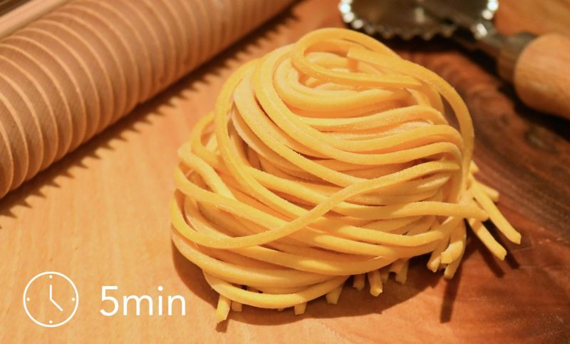 キタッラとはギターの意味で名のとおりギターの様に弦を張った専用の器具で押し切り、断面が正四角形の珍しいパスタ。